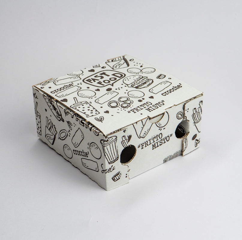 Box friggitoria in cartone microonda formato 15 × 15 × 7,5 cm, progettato per l’asporto di fritture miste, panini e street-food ad alto contenuto di oli. Il coperchio integrato a battente con asole di ventilazione favorisce la fuoriuscita del vapore limitando la condensa, mentre la linguetta frontale a incastro assicura chiusura rapida senza colle o punti metallici. L’impronta di base quadrata consente impilamento stabile nelle borse delivery, riducendo il rischio di schiacciamento e migliorando l’organizzazione del rider; il cartone certificato FSC garantisce provenienza da foreste gestite responsabilmente. La grafica generica stampata flexo con inchiostri a base acqua resiste a sfregamenti ed è idonea al contatto con alimenti. Dopo l’uso, la scatola può essere conferita nella raccolta carta se priva di residui eccessivi, contribuendo a un ciclo di smaltimento sostenibile.