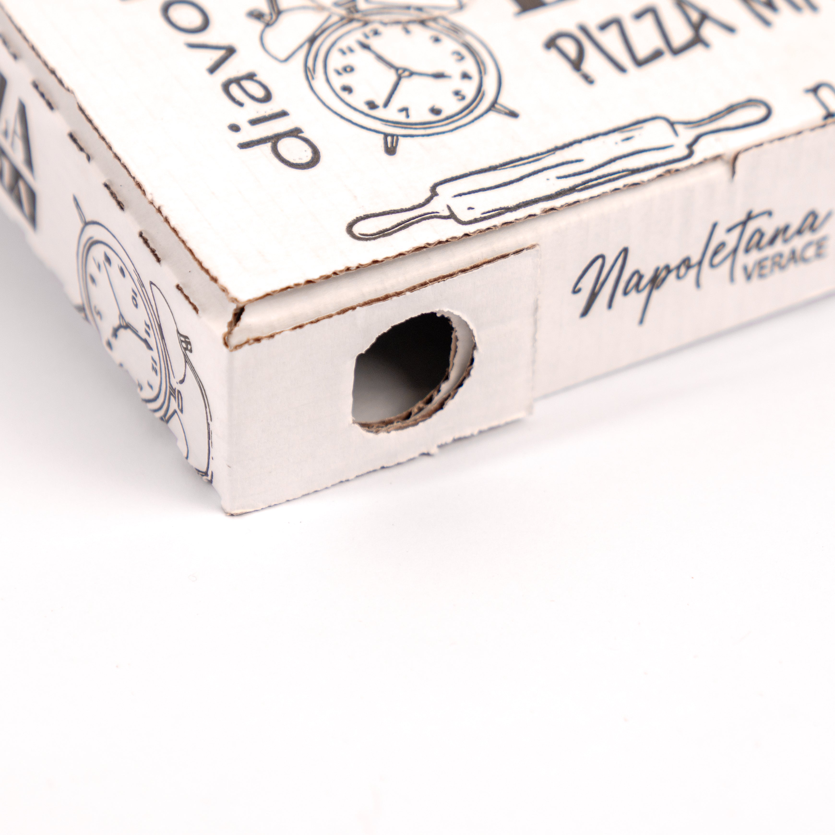 Scatole pizza 24 × 24 cm h 3 con chiusura italiana ad occhiello, realizzate in cartone microonda KBSAKB idoneo al contatto alimentare. Il cartone certificato FSC deriva da fonti gestite responsabilmente e l’inchiostro a base acqua garantisce stampa atossica. Lo spessore calibrato mantiene la scatola rigida anche con condimenti umidi, mentre il fondo rinforzato sostiene 2-3 tranci senza deformarsi. Impilabilità precisa e profilo a incastro velocizzano la preparazione di molteplici ordini in pizzeria, riducendo i tempi di linea e ottimizzando lo spazio sul banco delivery. Dopo l’uso, la scatola può essere conferita nella raccolta carta, agevolando il riciclo e riducendo il volume di rifiuti indifferenziati.