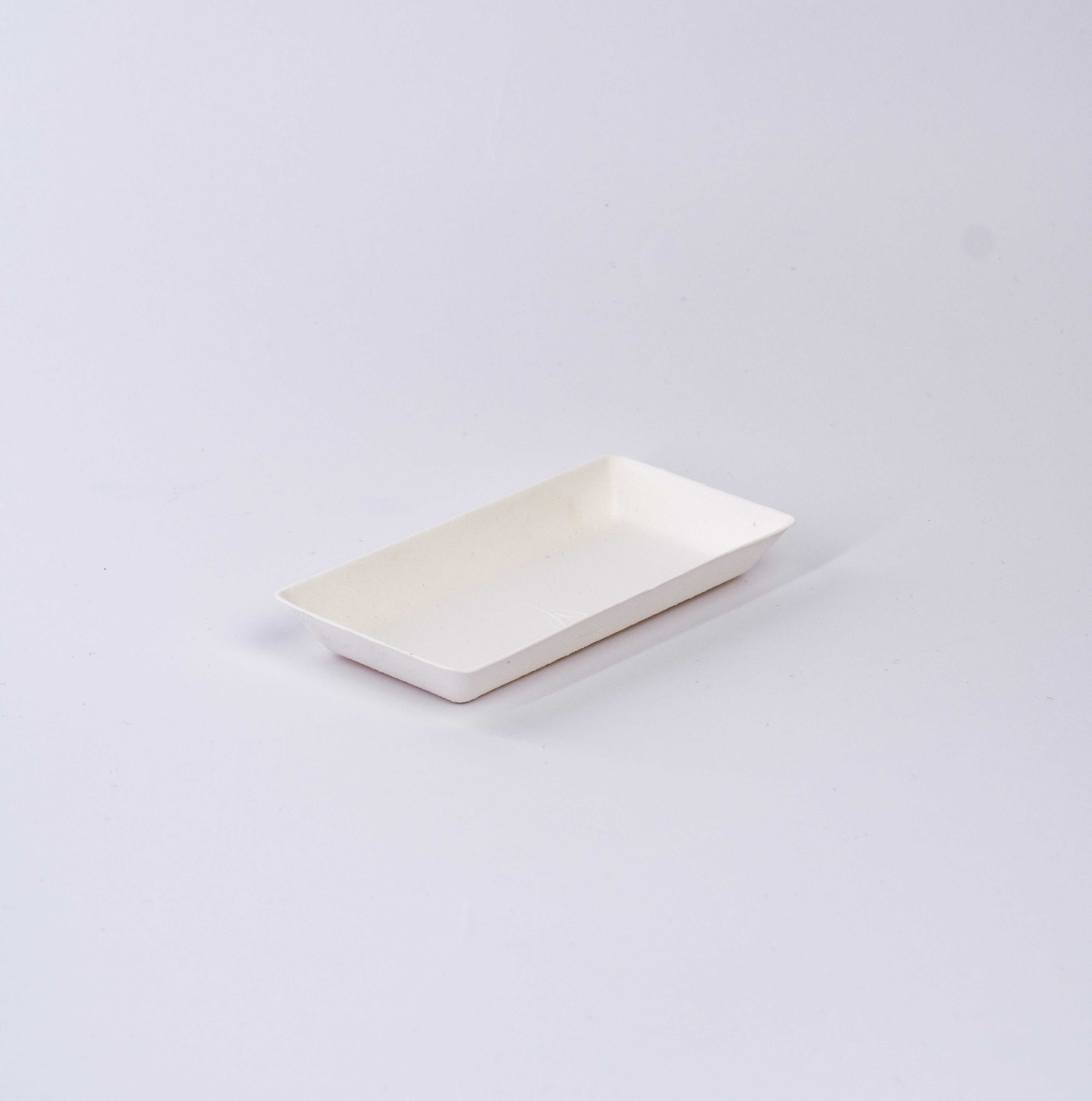 Finger food modello rettangolo 6,5 × 13 cm in polpa di cellulosa, studiato per roulade di pesce, mini-wrap, dessert stratificati o gamberoni in pastella, o fritture con stecco. La polpa di cellulosa resiste a forno 100 °C per 10 minuti; in microonde 700 W per 3 minuti mantiene rigidità evitando hot-spots che potrebbero danneggiare il cibo. La superficie leggermente satinata riflette la luce dei buffet LED donando risalto ai colori. Impilabilità ottimale e peso ridotto migliorano la logistica di grandi banchetti, mentre lo smaltimento in frazione organica completa l’approccio zero-plastic.