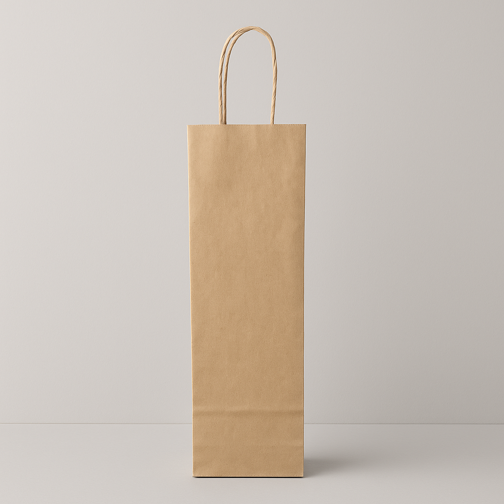 Sacchetti porta bottiglia avana in carta kraft naturale, formato 14 × 8 × 39 cm, pensati per packaging minimalista sostenibile. Manici ritorti avana incollati con adesivo vegetale, fondo quadra con rinforzo cartoncino che aumenta portata fino a 3 kg.