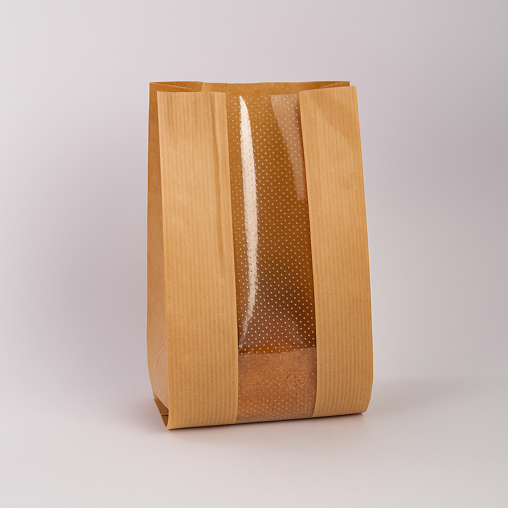 I sacchetti millerighe avana con finestra rappresentano la scelta preferita dai panifici per confezionare panini, rosette, pezzi di pane e baguette. La caratteristica finestra trasparente in PP microforato consente di intravedere il contenuto, invogliando i clienti all'acquisto grazie alla visibilità diretta del prodotto fresco. I piccoli fori presenti sulla finestra permettono al calore di fuoriuscire senza creare condensa, mantenendo la croccantezza e la freschezza del pane più a lungo. Il colore avana conferisce un aspetto naturale e artigianale, sottolineando l’attenzione alla qualità e alla tradizione che contraddistinguono ogni prodotto. Questi sacchetti uniscono praticità ed estetica, valorizzando ogni preparazione da forno con un tocco di autenticità..