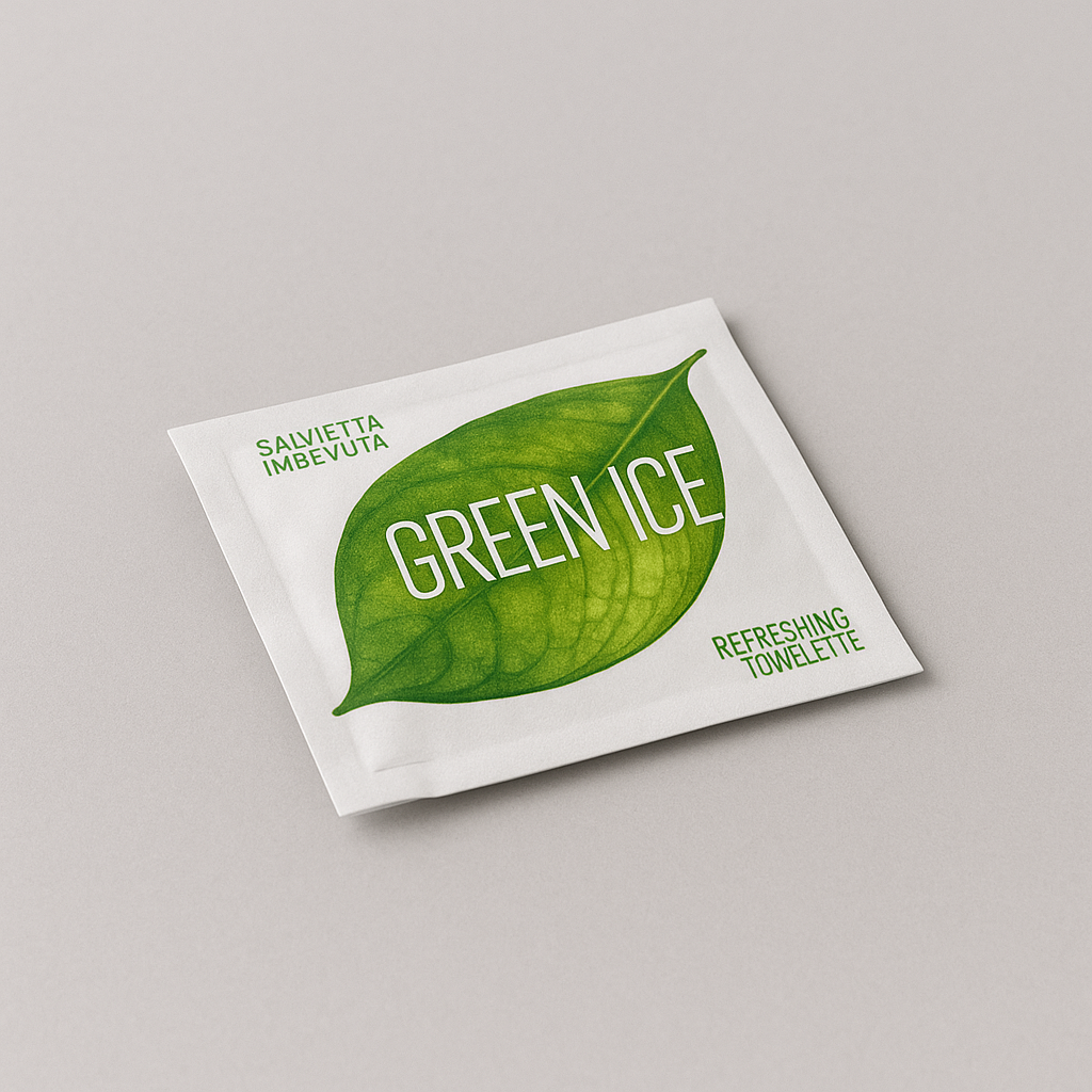 Salviettine rinfrescanti al tè verde confezionate singolarmente in bustina termosaldata, pensate per concludere l’esperienza gastronomica di ristoranti, pizzerie e pub con un tocco di igiene e piacevolezza olfattiva. La fragranza naturale di tè verde permane delicatamente, eliminando odori forti come aglio o fritti. Il flow-pack laminato multistrato PET/PE preserva integrità della formula fino a 24 mesi, impermeabile a ossigeno e umidità, con apertura a strappo facilitata che permette estrazione rapida anche con mani bagnate. Le dimensioni compatte della bustina ottimizzano lo spazio nei dispenser di sala, mentre il formato piegato della salvietta aumenta superficie utile a parità di volume.